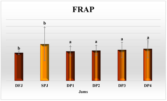 Ferric-reducing antioxidant power (FRAP) activity in jams (n = 3). The results are reported on a wet basis. Values with different superscript letters indicate a significant difference according to Tukey’s test (p ≤ 0.05).