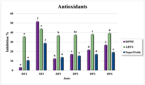 Antioxidant activity of jam, with respect to DPPH, ABTS, and superoxide (n = 3). The results are reported on a wet basis. Values with different superscript letters indicate a significant difference according to Tukey’s test (p ≤ 0.05).