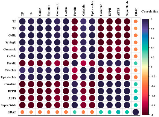 Correlation heatmap among the contents of TP, TF, phenolic compounds, and antioxidant activity in jams, evaluated using a color diagram.