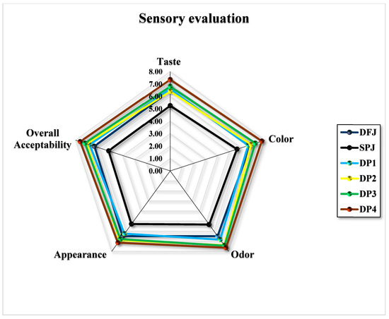 Figure 8 illustrates the sensory analysis, which involved preference tests regarding the taste, color, odor, appearance, and overall acceptability. The SPJ containing 100% sweet potato had the lowest score in all preferences tested (5.25 ± 0.79, 5.65 ± 0.81, 5.35 ± 0.81, 5.30 ± 0.92, and 5.20 ± 0.77 for taste, color, odor, appearance, and overall acceptability, respectively), followed by DFJ, while the mixed formulations of the jams increased in score gradually with an increased percentage of mixing. DP4, which had 50% DFJ and 50% SPJ, presented the best product scores in all tested sensory preferences (7.35 ± 1.53, 7.75 ± 091, 7.65 ± 0.99, 7.15 ± 1.18, and 7.60 ± 1.23, respectively).