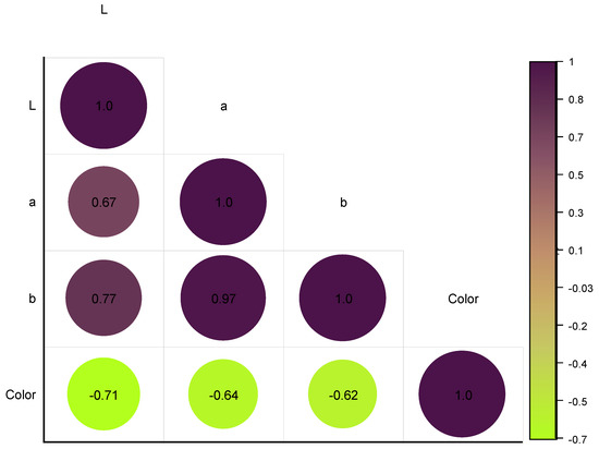 The results in Figure 9 show that there was a strong positive correlation between L* and a* values (r = 0.676) and a very strong positive correlation between a* and b* values (r = 0.967 **). There was also a strong positive correlation between L* and b* values (r = 0.780). These results suggest that, as the L* value increased (i.e., the color became lighter), the a* and b* values also tended to increase (i.e., the color became more red and yellow, respectively). Additionally, as the a* value increased (i.e., the color became redder), the b* value also tended to increase (i.e., the color became more yellow). These relationships are commonly observed in color science, and they are known as opponent process theory.