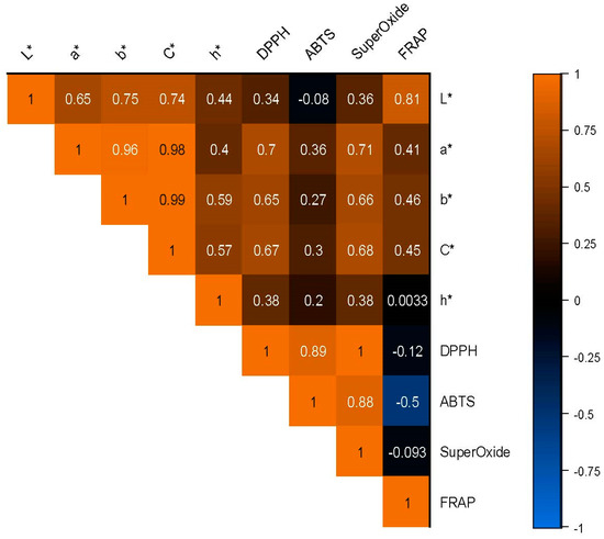 Figure 10 illustrates that L* is significantly correlated with a* (r = 0.652 **) and b* (r = 0.749 **), indicating that the lightness of a substance is related to its redness and yellowness. C* is also significantly correlated with a* (r = 0.975 **) and b* (r = 0.994 **), suggesting that the chroma of a substance is strongly related to its colorfulness. Furthermore, the DPPH is strongly correlated with ABTS (r = 0.893 **) and superoxide (r = 0.999 **), indicating that these assays are highly related and may be used interchangeably. However, it should be noted that ABTS is negatively correlated with superoxide (r = −0.502 *), suggesting that these assays may not always afford identical results. Remarkably, the hue angle of a substance is only weakly correlated with the other variables. Lastly, the FRAP is strongly correlated with L* (r = 0.811 **), a* (r = 0.414), b* (r = 0.462), and C* (r = 0.454). This suggests that color and antioxidant capacity may be related in complex ways and that different colorimetric variables may be more or less important depending on the specific test being used.