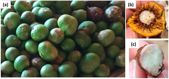 Pequi is a quadrupoid fruit (Figure 1) with a greenish-brown exocarp and two mesocarps. A white pulp forms the external mesocarp, and a light yellow to dark orange pulp forms the internal mesocarp. The latter is the edible fruit portion inside that covers a brown and spiny endocarp []. It consists of approximately 84% husk, 6% endocarp, 8% pulp, and the remaining 2% is almond, totaling an average mass of 120 g. The average height of the pequi is 5.8 cm, and the diameter varies between 5.54 cm and 6.48 cm [].