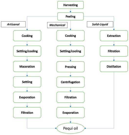 The artisanal extraction of pequi oil is an ancient technique. This process is carried out with fruits in natura subjected to cooking and aqueous extraction using boilers, such as pans, paint cans, or even an old refrigerator compartment []. It involves a series of unit operations of separation and heat exchange and is adopted by many families living in economically vulnerable conditions in the Cerrado. In this sense, due to its economic and social significance, the technique has great potential to be recognized as part of Brazil’s intangible cultural heritage. Because sophisticated equipment or methodologies are not used, the productivity, yield, and oil quality are low compared to other techniques. According to Aquino et al. [], for the artisanal extraction of 1 L of pequi, approximately 50 dozen fruits and 10 h of work are needed. Despite the lower oil extraction yield compared to other methods, the pequi oil obtained by hand has a composition rich in nutrients and greater stability during storage at room temperature [].