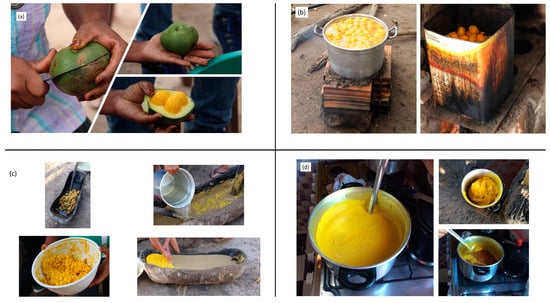(a) Peeling of the fruits; (b) cooking of the fruits; (c) maceration of cooked fruits; (d) evaporation (source: the authors).
