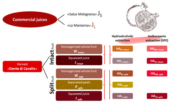 In view of the impressive growth of its market, but also due to the underlying potentialities and problems linked to this crop, the present work aims to show the compositional differences between intact and split fruit in order to prevent the loss of the latter as waste [8]. Fruits belonging to “Dente di Cavallo” variety, the most prevalent cultivar in Italy, cultivated in the Apulia region, were directly harvested. The fruits were processed as such or separated into their constitutive parts (peels and arils), subjected to extraction procedures, analyzed in their polyphenolic composition, color and volatile and aromatic components. Finally, inhibitory activity against three important enzymes (tyrosinase, acetylcholinesterase and α-glucosidase) for therapeutic applications was also assessed through in vitro assays and compared with suitable reference compounds. In order to evaluate the quality of the obtained squeezed juice, the derived commercial juices “Salus Melagrana” and “La Marianna” were submitted to the same protocol analysis for comparison (Figure 1).