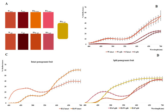 Palette of analyzed samples (A); reflectance curves related to W and J (intact and split) samples (B); reflectance curves related to obtained hydroalcoholic extracts (C,D).