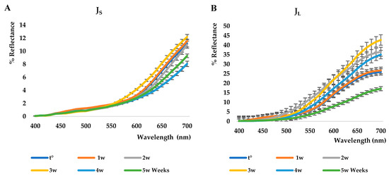 Figure 3A,B shows the reflectance curves related to the shelf-life study conducted on JS and JL juices kept at 40 °C for five weeks. Regarding JS, a color change is observed after the first week, and it remains constant until the third week, when a bleaching phenomenon is observed. On the contrary, around the fourth and fifth weeks, a darkening is observed, probably associated with a higher concentration of ellagitannins (see also HPLC data). A substantially different trend is registered for JL. In fact, darkening is found in the first week, followed by bleaching until the third week, and then darkening again around the fifth week.