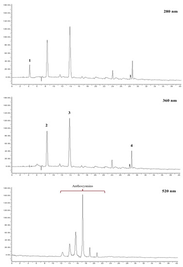 The different hydroalcoholic extracts obtained from pomegranate fruits of “Dente di Cavallo” and the two related commercial juices were subjected to HPLC-DAD analysis. The analyses were performed at 280 nm for the identification of phenolic acids, at 360 nm for the identification of the ellagitannin profile, mainly represented by punicalagin (α + β) and ellagic acid, and at 520 nm for the identification of the anthocyanins. Compounds were identified by external standard or by comparison with the literature [18,19]. As anthocyanins were not directly detectable from these extracts, they were analyzed after a further step of solid phase extraction, which made it possible to concentrate and quantify these pivotal compounds as well. Examples of chromatograms related to the HAW split and HAWA split samples are shown in Figure 4.