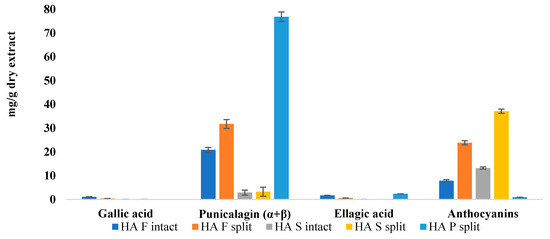 Further considerations were made by analyzing extracts from the intact or split fruit. As shown in Figure 5, the amount of ellagitannins, especially punicalagins, and anthocyanins appears to be higher in extracts from split fruits with respect to intact fruits. This information is very interesting, as it is related to the fact that ripening and storage can influence the matrix phytocomplex [20,21]. Such evidence could confirm what was observed in the colorimetry, as lower reflectance curves of split samples correspond to higher concentrations of ellagitannins and anthocyanins.
