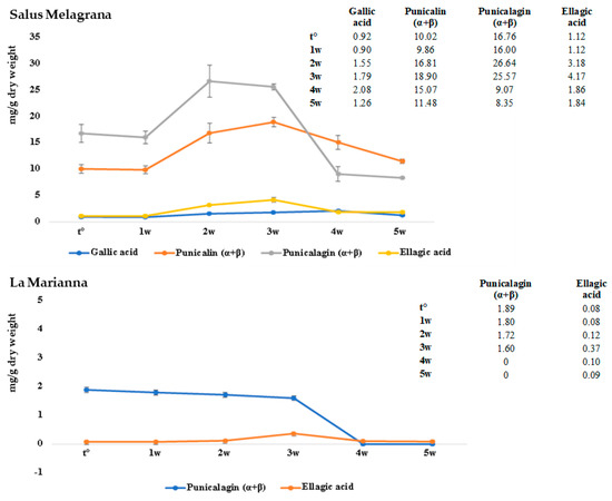 With regard to punicalagin, whereas in JL there is a sharp drop after three weeks, in JS there is a slight decrease in the first weeks and then it stabilizes around four to five weeks at lower values with respect to the t°. At the same time, punicalin, identified only in JS, increases as punicalagin decreases between the second and third week, coming back to the initial values around five weeks. In conclusion, a decrease in punicalagin could be observed, whereas punicalin and ellagic acid tend to reestablish at the initial values, in an observation period of five weeks at 37 °C. Gallic acid, represented in smaller quantities comparable to those of ellagic acid, appears quite stable for the duration of the whole experiment.
