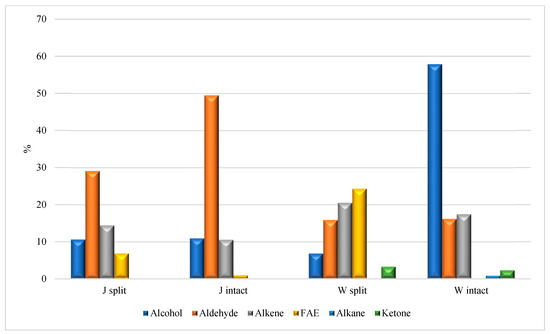 Comparison in the distribution of the prevailing classes of compounds in split and intact HAJ and HAW.