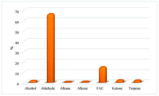 GC-MS is the technique of choice to detect and identify apolar and medium-polarity metabolites arising from vegetable and food matrices [22,23]. In the present study, the HS-SPME/GC-MS analysis of split and intact HAJ and HAW samples made it possible to identify several compounds clustered according to their chemical classification (Table 3 and Table 4), and these are reported in Figure 7. Aldehydes represent the prevalent class of chemicals in the HAJ samples (Figure 7), with a larger abundance in the HAJ intact, mainly due to the presence of hexanal (not detected in HAJ split), nonanal (6.4 vs. 11.2% in HAJ split and HAJ intact, respectively) and decanal (7.2 vs. 12.4% in HAJ split and HAJ intact, respectively). The HAW samples differ mainly due to the abundance of alcohol (6.8 vs. 57.9% in HAW split and HAW intact, respectively), which is completely ascribable to the presence of carvacrol in HAW intact, and the FAE distribution (24.3% in HAW split but totally absent in HAW intact). The absence of carvacrol, even in trace amounts, in all the other analyzed samples is a reasonable clue of its presence in the seeds of the pomegranate. A further comparison between the four analyzed samples reveals the following details: (i) the alkene distribution in the four analyzed samples ranges between 10.5 in HAJ intact and 20.5 in HAW split; (ii) the FAE class was detected in the HAJ split and HAW split samples (6.8 and 24.3%, respectively), but was poorly concentrated (0.9%) and absent in HAJ intact and HAW intact, respectively; (iii) methoxy phenyl oxime, a compound naturally occurring in food matrices but also recognized as a SPME fiber contaminant, was detected in all samples except for HAW intact [24,25]. Lastly, the HS-SPME/GC-MS analysis of the HAP split (Table 5 and Figure 8) pointed to aldehydes as the most abundant class of compounds (66.4%), with nonanal and decanal comprising the largest part (47.3%).