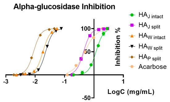 As a general trend, the HAJ intact and HAJ split samples showed the lowest inhibitory activity among all, and for acetylcholinesterase and tyrosinase, we could not determine any activity. In all the samples, the inhibitory activity against acetylcholinesterase and tyrosinase was weak, with values at least 100 times higher than the positive controls used. For the α-glucosidase enzyme, the only sample with activity lower than the positive control (acarbose) was HAJ intact, with an IC50 of 294.25 μg/mL. Regarding the same enzyme, the sample HAP split showed the highest inhibitory activity, with an IC50 of 2.20 μg/mL, followed by HAW intact and HAW split. These results can also be observed in Figure 9, where the logarithmic inhibition curves show better activity than acarbose (IC50 of 122.27 μg/mL) for all samples, with the exception of HAJ intact.