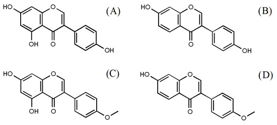 Chemical structures of red clover isoflavones: (A) genistein, (B) daizein, (C) biochanin A, (D) formononetin.
