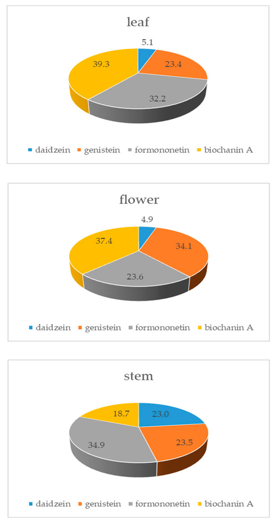 Leaves were on average the richest source of isoflavones (5.96 ± 3.04 mg/g), which were followed by flowers (1.78 ± 0.77 mg/g) and stems (1.10 ± 050 mg/g). In leaves, the total isoflavone content varied greatly among the red clover samples from 0.87 to 13.05 mg/g (Table 2). If the average distribution of individual isoflavones in the whole plant is observed, it can be noticed that biochanin A makes up over 36% of the total isoflavones, while the average percentage of formononetin is about 30%. In different plant parts, individual isoflavone distribution can vary (Figure 2). Leaves, having the highest total isoflavone content, dictate the average distribution in the whole plant, since biochanin A and formononetin make up over 70% of total isoflavones. In flowers, a high percentage of genistein is present (34.1%), with biochanin A having the highest content (37.4%). On the other hand, in stems, formononetin is the dominant isoflavone (34.9%), and there is a quite high share of daidzein (23%). Biochanin A is, surprisingly, the isoflavone with the lowest content in stems (18.7%) (Figure 2 and Figure 3). The application of ANOVA has demonstrated statistically significant differences in the quantified amounts of daidzein (F(177,2) = 26.71, p = 0.001), genistein (F177,2) = 39.37, p = 0.001), formononetin (F(177,2) = 68.27, p = 0.001) and biochanin A (F(177,2) = 11.54, p = 0.001) related to the analyzed plant parts, whereas the application of a post hoc Tukey’s HSD test indicated specific plant parts contributing to the recorded differences (Figure 3).