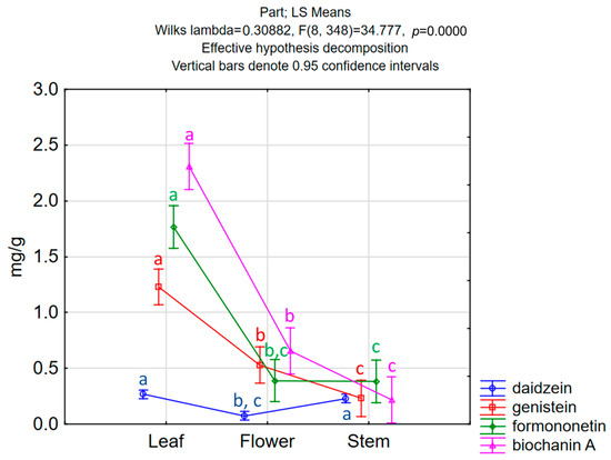 ANOVA results—differences in individual isoflavone content among plant parts; different small letters indicate statistically significant differences.