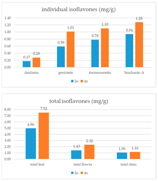 Concerning the ploidy of the analyzed samples, it can be noticed that 4n plants had, on average, higher amounts of all detected isoflavones. A similar trend was observed for the total isoflavone content in different plant parts. More specifically, the total isoflavone content in leaves and flowers of 4n samples was over 50% higher compared to its content in 2n samples (Figure 4). When a t-test was applied, it was established that 2n and 4n cultivars are significantly different concerning the daidzein (t(178) = −5.02, p = 0.001), genistein (t(178) = −4.62, p = 0.001) and formononetin (t(178) = −2.49, p = 0.010) content. On the other hand, the profile of individual isoflavones was on average very similar in the 2n and 4n samples (Figure 4).