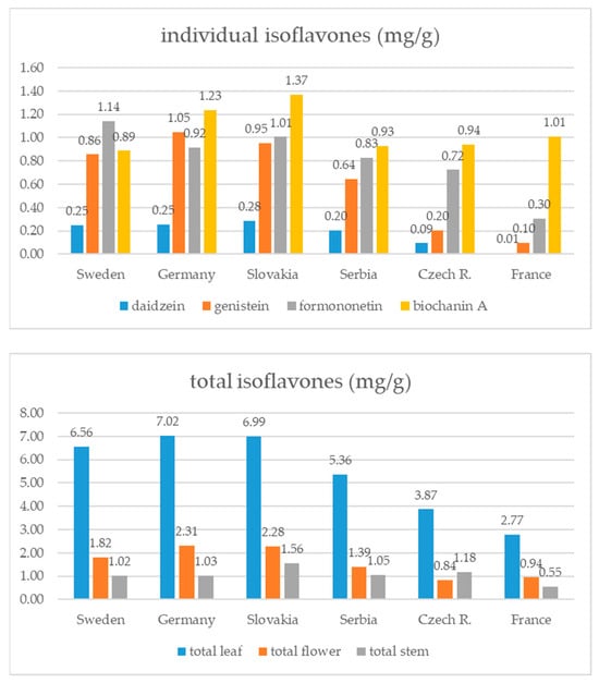 According to the country of seed origin, the red clovers from Slovakia and Germany had the highest average total isoflavone content (3.61 ± 2.94 and 3.45 ± 2.18 mg/g, respectively), while the lowest isoflavone content was noticeable in the samples from France (1.42 ± 1.18 mg/g). Generally, the individual isoflavone share follows the same order—biochanin is the dominant compound, which is followed by formononetin, genistein and daidzein. The contribution of individual isoflavones differs in samples originating from Sweden and Germany, since in the Swedish samples, formononetin is the dominant isoflavone, and in the German genotypes, the content of genistein is higher than the formononetin content (Figure 5). Concerning the plant part, generally, leaves were the richest sources of isoflavones and stems had the lowest content regardless of the country of seed origin. Only samples from the Czech Republic had the lowest isoflavone content in flowers compared to other plant parts (Figure 5).