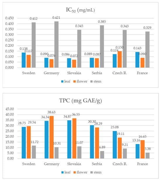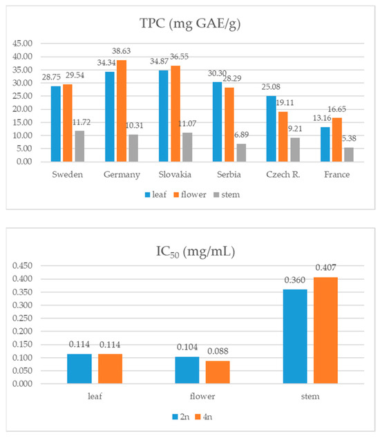 Generally, it can be noticed that stems have lower TPC values as well as antioxidant potential compared to other plant parts. ANOVA showed that TPC and IC50 values are different in all the analyzed plant parts (F(2.177) = 125.07, p = 0.001; (F(2.177) = 574.23, p = 0.001), respectively), whereas a post hoc test indicated that differences exist between the TPC content and antioxidant activity of stems compared to leaves and flowers. The lowest IC50 values were observed in flower extracts, meaning that they have the highest average antioxidant potential (0.099 ± 0.035 mg/mL). At the same time, flower extracts contained the highest amount of total phenolics (28.52 ± 9.74 mg GAE/g on average). Sample m40 (4n, Germany) demonstrated the highest TPC value in leaf (38.38 mg GAE/g) and flower (47.05 mg GAE/g) extract as well as the lowest IC50 value in flower extract (0.059 mg/mL) (Table 3). Also, it can be observed that the sample m21 (4n, Sweden) had the highest TPC (16.84 mg GAE/g) and antioxidant potential (0.228 mg/mL) among stem extracts. Samples originating from France had the lowest TPC in all plant parts (Table 3).