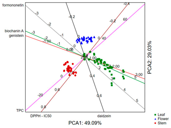 The application of PCA on the dataset describing the phytochemical profile of the analyzed samples in terms of total phenolic content and quantities of formononetin, biochanin A, genistein and daidzein, as well as antioxidant potential (expressed as IC50 value) by taking into account the analyzed plant part, shows that the first two principal components describe around 80% of the samples’ variability. The size of the variability mostly correlates to the recorded antioxidant potential of samples, the content of formononetin and biochanin A, as well as the total phenolics content. The position of the analyzed samples and variables in the space defined by the first two principal components (Figure 8) indicates separative grouping of the stem extracts as a result of the lower antioxidant potential and total phenolics content. On the other hand, the flower extracts were the most potent scavengers of DPPH radicals, while the leaf extracts contained the highest quantities of biochanin A and formononetin.