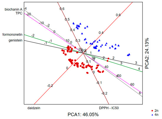 Furthermore, if we process the same dataset by taking into the account the average values of the examined variables in three plant parts and the ploidy of the analyzed samples (2n/4n), the results show that the first two principal components describe around 70% of the samples’ variability. The recorded variability mostly correlates with biochanin A and genistein quantities as well as with antioxidant potential. However, the position of the analyzed samples in the space defined by the first two principal components (Figure 9) indicates daidzein as an important marker responsible for the separative grouping of 2n and 4n samples with quantities higher in 4n samples.