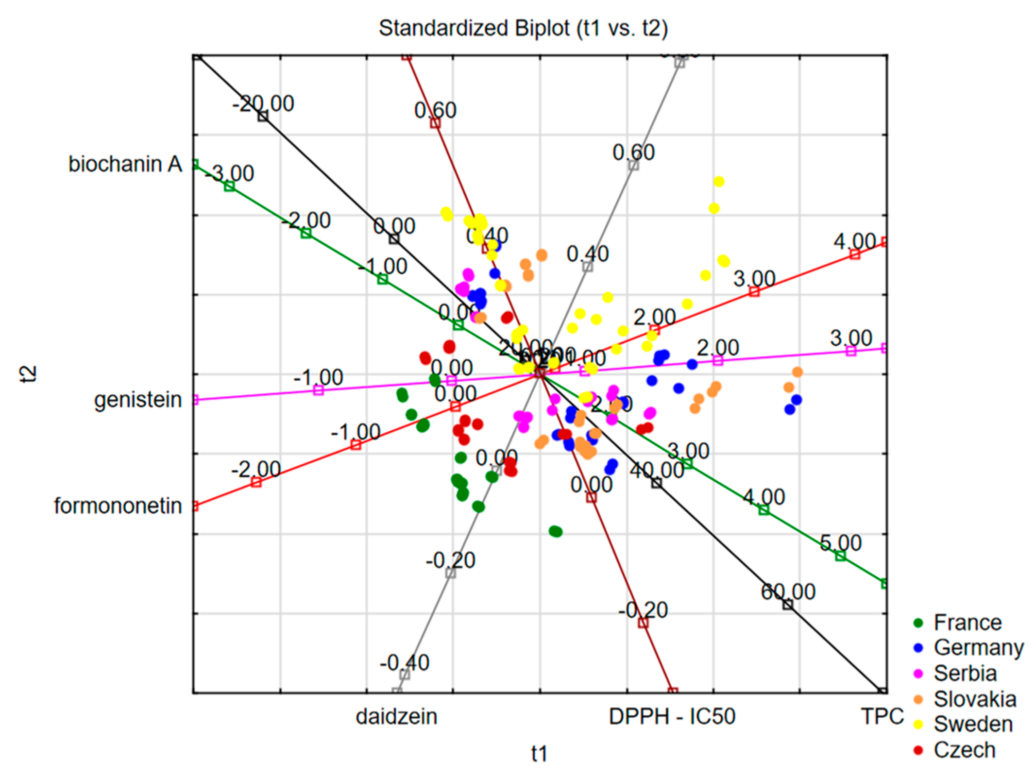 When the data for isoflavone content, antioxidant activity and TPC were analyzed according to different countries of red clover seed origin, there was no separative grouping of the studied samples. However, it can be observed that the samples from Sweden and the samples originating from France belong to two separate groups when all tested parameters are taken into account (Figure 10).