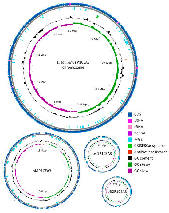 Chromosome and plasmids map of L. salivarius P1CEA3 created using Proksee v1.0.0a6 server (not to scale). This map shows the spread of CDS, tRNA, rRNA, ncRNA, MGE (mobile genetic elements), CRISPR-Cas systems, antibiotic resistance, and the GC content shift.