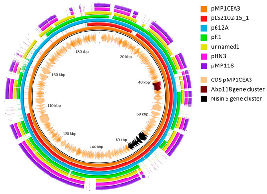 Furthermore, pMP1CEA3 was compared with other six megaplasmids identified in other L. salivarius strains with a high percent identity. Of interest were the differences observed in the gene clusters involved in the synthesis and secretion of the Abp118 and nisin S bacteriocins encoded in pMP1CEA3 compared to the other megaplasmids (Figure 2). The Abp118 gene cluster was present with high percent identity in pLS2102-15_1 and p612A. However, in pHN3, pMP118 and unnamed1 this region showed a lower percent identity, and in pR1, this gene cluster was absent. Importantly, the absence of the nisin S gene cluster was observed in four of the compared megaplasmids but not in two of them (pLS2102-15_1 and p612A). Differences in size and other genomic attributes (Table S1) had been also observed between circular megaplasmids of different strains of L. salivarius [57].