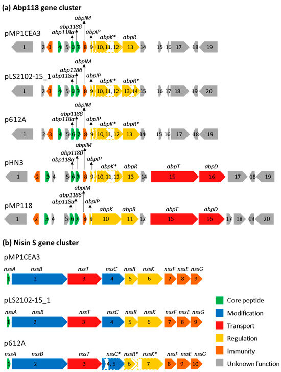 (a) Abp118 and (b) nisin S bacteriocin gene clusters in pMP1CEA3 from L. salivarius P1CEA3 as compared to those in megaplasmids pLS2102-15_1, p612A, pHN3 and pMP118. BAGEL v.4.0 and SnapGene v.7.0.3 programs were used as templates to generate the diagram. ORFs are indicated by arrows and numbers, and gene identity and color denote those with known functions. ORFs marked with a dashed arrow and their gene identity with an asterisk indicate putative non-functional ORFs.