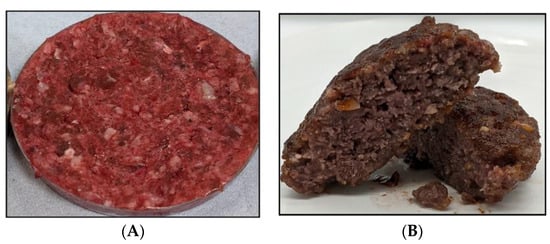 For a product to be a viable meat alternative, similar color before and after cooking should be delivered as this affects the purchasing intent of the consumer []. To improve the color profile of meat alternatives, different attempts have been made. For decades, synthetic food coloring agents have also been widely used in PBMAs. However, consumers find these undesirable due to side effects including toxicity, allergies, and neurocognitive effects. Hence, naturally occurring pigments like anthocyanin, carotenoids, and curcuminoids are used as coloring pigments. Initially, heat-stable coloring agents like annatto, carotenoids, caramels, and turmin were used to provide the desired color in sausages but meat alternatives generally also require a change in color after cooking from red to brown. Therefore, the use of natural heat-stable coloring agents is not appropriate. However, according to Plant-Ex Ingredients Ltd. (an international company in United Kingdom specialised in the manufacture of ingredients for color, flavor, and extracts), the red beet is an ideal coloring agent for products like burgers and minced meat products (as incorporated in a burger from The Beyond Burger company), as it gives a strong pink–red color to the raw product and after heating, the sugar in the beet caramelises and turns a shade of brown. In Figure 2A, an uncooked alternative sample with red beet colorant is shown, and Figure 2B shows the sample after cooking which displays the change in color from red to brown []. This change in color explains the objective of combining the reducing sugar (maltose, dextrose, lactose, mannose, or arabinose) with the heat-labile colorant []. The other method is the use of a myoglobin alternative. Food companies such as Impossible Foods are using a recombinantly produced soy leghaemoglobin from fungus and beetroot extract to mimic the color of raw meat [,]. Before the cooking process, the leghaemoglobin provides a fresh meat color to the product; however, after cooking, a color change takes place because of the Maillard reaction.