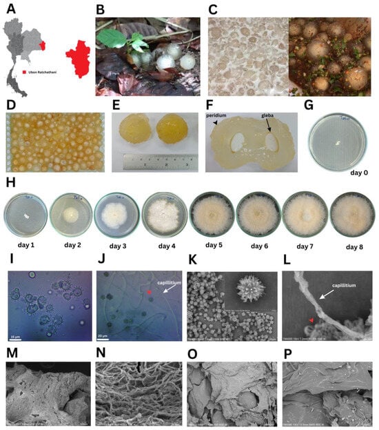 Puffball mushroom morphological characteristics: (A) map of Thailand showing where the puffball mushrooms were collected in Ubon Ratchathani Province (red), (B) puffball mushrooms on the ground under foliage, (C) dessert in coconut milk (left) and Koi Hed Ta Lo in spicy condiment (right), (D) puffball mushrooms after washing, (E) diameter of puffball mushrooms, (F) white powdery spores “gleba” (arrow) and the exoperidium (arrowhead), (G) spores placed on PDA at day 0, (H) mycelial growth on PDA at day 1–8, (I) light microscopic morphology of fungal green spiny spores at 400×, (J) microscopic morphology of spores (red arrowhead), and hyaline gelatinous hyphae (black arrow) at 1000×, (K) spores under SEM at 500× and 5000×, (L) capillitial thread at 5000×, (M) fresh hyaline gelatinous hyphae at 100×, (N) enlarged image of M at 2000×, (O) freeze-dried powder of gelatinous tissue of the fruiting body at 60×, and (P) enlarged image of O at 400×.