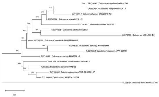 Sixteen ITS sequences from mushrooms of Calostoma, Boletus (relative), and Russula (outgroup) genera were aligned. The fungal isolate from the puffball mushroom collected in Ubon Ratchathani Province, Thailand, was identified as C. insigne (GenBank accession no. OQ230464.1); it was evolutionarily closest to C. insignis Arora98-31 (EU718092.1) found in Thailand [32], with 99% sequence similarity based on the BLAST search, and formed an individual clade in the phylogenetic tree (Figure 2). These two species were distinctly evolved from Calostoma mushrooms in China, Malaysia, Japan, Australia, and the USA.