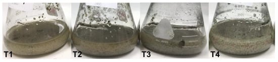 Mycelial pellet formation during 5-day cultivation in T1–T4 media.