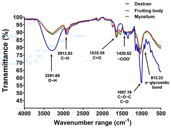 FTIR spectroscopy was used to analyze the polysaccharide structures. The FTIR spectra of the dried gelatinous fruiting body and mycelial pellet extract both exhibited covalent bond molecular vibrations (4000–500 cm−1). The infrared absorption characteristics of the polysaccharides were observed at frequencies of 3291.69 cm−1 (O−H), 2913.83 cm−1 (C−H), 1630.58 cm−1 (C=O), 1420.52 cm−1 (−COO-), 1097.19 cm−1 (C−O−C, C−O), and 912.23 cm−1 (α-glycosidic bonds) (Figure 4), with dextran standard used for comparison.