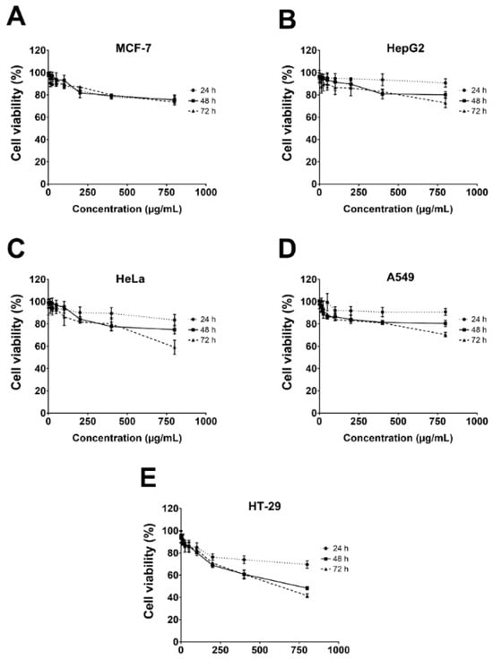 The cytotoxicity of the gelatinous fruiting body extract towards the five cancer cells, i.e., HepG2 (liver), MCF-7 (breast), HeLa (cervical), A549 (lung), and HT-29 (colon), was conducted using the MTT assay. Results showed that cytotoxicity was only weakly effective towards HT-29 at very high concentrations (IC50 of 770.6 ± 5.0 µg/mL at 72 h and %cell viability of 41.6 ± 1.8% at 800 µg/mL at 72 h) (Figure 6).