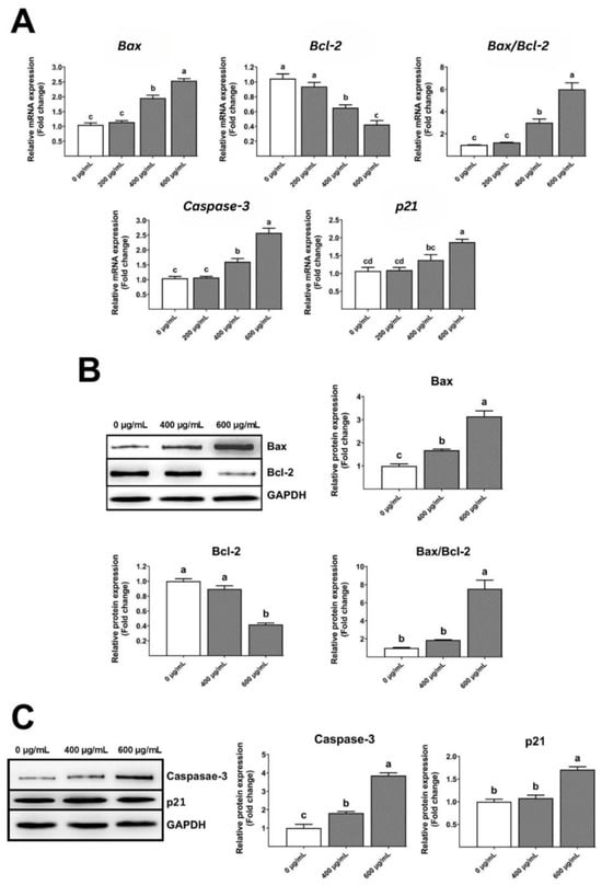 Effects of the gelatinous fruiting body extract on apoptosis gene and protein expressions: (A) real-time analysis of gene expressions, (B) Western blot analysis of Bax and Bcl-2 protein expressions, and (C) Western blot analysis of caspase-3 and p21 protein expressions. Different lowercase letters on the bars indicate significant differences (p < 0.05).