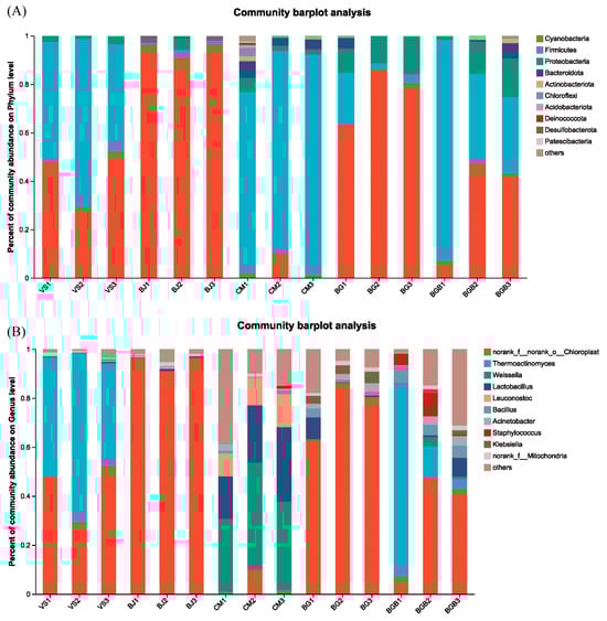 To further analyze the community in the fifteen samples, phenotype prediction at the genus level was employed to analyze the Gram-positive and Gram-negative bacteria composition. As shown in Figure 6, groups VS, CM, and BGB were predominantly composed of Gram-positive bacteria, while Gram-negative bacteria were dominant in groups BJ and BG. Specifically, group CM had Weissella, Lactobacillus, and Leuconostoc as the dominant Gram-positive bacteria. In groups VS and BGB, Thermoactinomyces was the dominant Gram-positive bacterium, while Weissella, Lactobacillus, and Staphylococcus were present in smaller proportions in group BGB. The Gram-negative bacteria norank_f_norank_o_Chloroplast and norank_f_Mitochondria were detected and dominant in groups BJ and BG. Additionally, the Gram-negative bacteria Klebsiella showed a proportion of 19.32% in group BG.