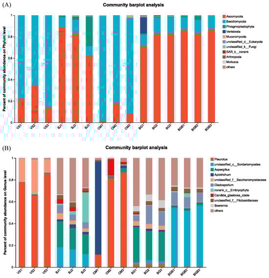 For the fungal community, the 403 OTUs in a total of fifteen samples were classified into 22 phyla, 56 classes, 84 orders, 124 families, 145 genera, and 170 species. At the phylum level, the dominant phyla were Ascomycota, Basidiomycota, and Phragmoplastophyta, which, together, accounted for 98.63% of the total reads in the fifteen samples (Figure 2A). In groups BJ, BG, and BGB, Ascomycota showed the highest proportion, accounting for 78.16%, 79.09%, and 85.53%, respectively. In contrast, the dominant phylum in groups VS and CM was Basidiomycota, contributing 76.42% and 89.8%, respectively. Phylum Phragmoplastophyta, with a lower abundance, was found in groups BJ, BG, and BGB, with proportions of 10.63%, 0.71%, and 1.62%, respectively. Additionally, another phylum, Vertebrata, was found in group BG with a proportion of 5.02%, which was lower than 0.01% in the other four groups.