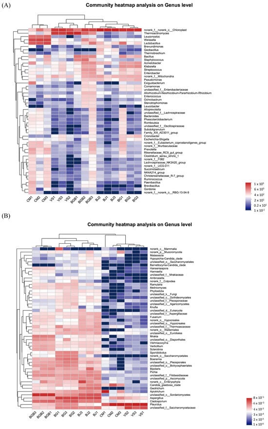 Heatmap analysis of the microbial community of the fifteen plant-based meat analogues. (A) Heatmap analysis of the bacterial community; (B) Heatmap analysis of the fungal community. The heatmap only showed the relative abundance of the top 50 genera of the bacterial and fungal communities, respectively.