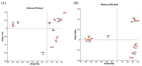 Principal co-ordinates analysis of the microbial community of the fifteen plant-based meat analogues. (A) Principal co-ordinates analysis of the bacterial community; (B) Principal co-ordinates analysis of the fungal community.