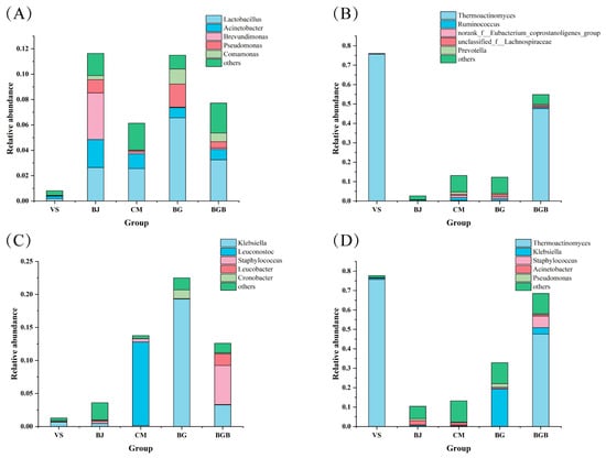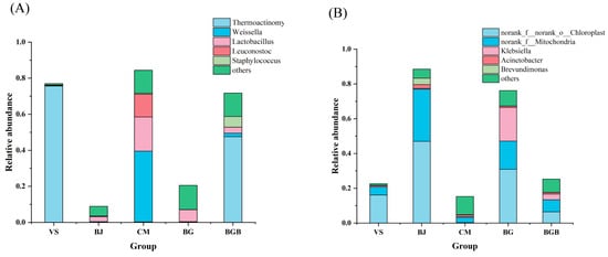 At the genus level, the dominant genera in all fifteen samples were norank_f_norank_o_Chloroplast, Klebsiella, Acinetobacter, and norank_f_Mitochondria, which accounted for over 90% of the sequences (Figure 1B). However, there were noticeable differences in their proportions among the five groups. In the CM group, the genus norank_f_norank_o_Chloroplast had a low proportion of 3.94%, while it ranged from 32.45% to 94.60% in the VS, BJ, BG, and BGB groups. The four most dominant genera in the CM group were Weissella, Lactobacillus, Leuconostoc, and Acinetobacter, with contributions of 36.57%, 23.75%, 11.33%, and 1.23%, respectively. In the BJ, CM, and BG groups, the genus Thermoactinomyces accounted for less than 1% of the total reads, with proportions of 0.01%, 0.2%, and 0.039%, respectively. In contrast, the VS and BGB groups had a much higher percentage of Thermoactinomyces, with occupancies of 53.15% and 31.99%, respectively.