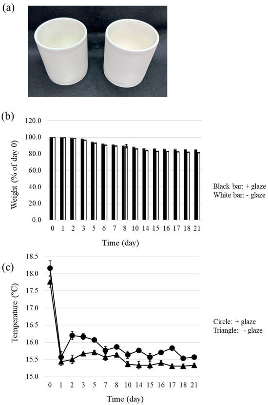 The ceramic containers used in this study were produced by Kyoutou Yougyou Co. (Tajimi, Gifu prefecture, Japan). Both the glazed and unglazed containers were cylindrical and had the following dimensions: 9 cm diameter, 10 cm depth, and 4 mm thickness. The firing temperature (max. 1170 °C) was determined on the basis of a previous trial that considered the correspondence among pottery porosity, water absorption rate, and firing temperature.