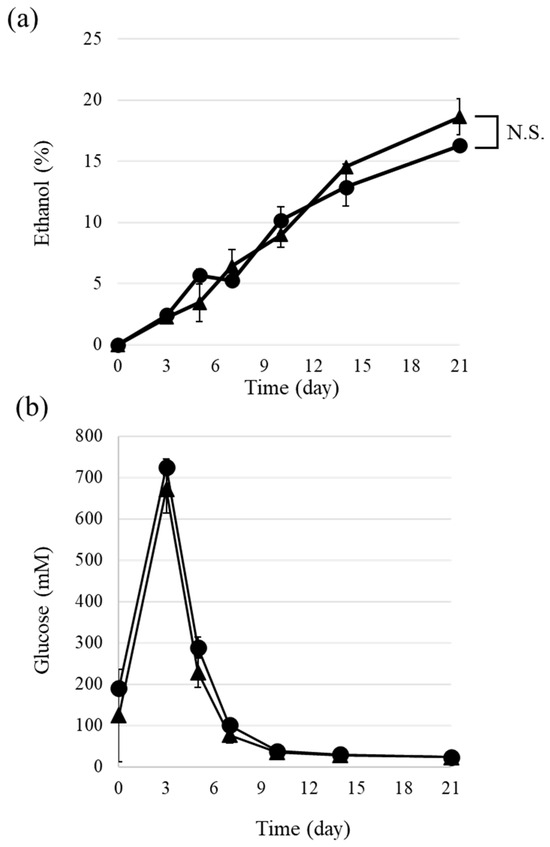 Concentrations of ethanol and glucose in the pottery-brewed sake samples. (a) The ethanol concentration (%, v/v) of aliquots of sake samples were determined. Circles, glazed; triangles, unglazed. N.S., not statistically significant (p > 0.05). (b) The glucose concentrations (mM) of aliquots of sake samples were determined. Circles, glazed; triangles, unglazed. Data represent the averages of three independent experiments; error bars indicate standard deviations.
