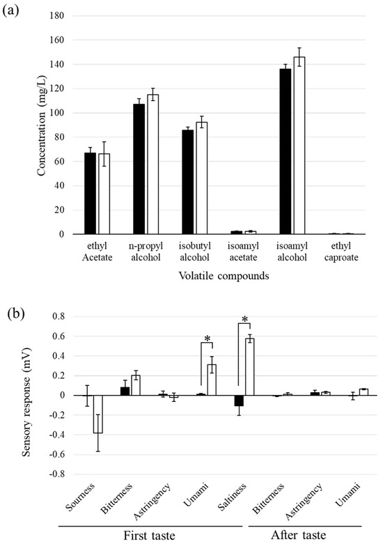 Taste and volatile components in sake samples brewed in glazed and unglazed ceramic containers. (a) Volatile compounds and representative compounds in sake were analyzed by using GC–MS. Black bars, glazed; white bars, unglazed. (b) The brewed sake samples were analyzed using a taste-sensory system. Asterisks indicate significant differences at p < 0.05. Data represent the averages of three independent experiments; error bars indicate standard deviations.