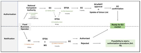 The Commission Implementing Regulation (EU) 2017/2468 provides templates to guide the FBO in delivering the scientific and administrative requirements for the Notification [62]. The Notification is addressed to the Commission which, after a validity check of no longer than thirty days, forwards it to the MS and the EFSA. An examination period of four months is dedicated to the MS and the EFSA concerning the safety of the food. Based on the outcome, the Commission informs all the parties regarding the approval of the traditional food. If the decision is favourable, the traditional food can be marketed in the EU, and the Union list is updated. For cases where the Commission does not approve its commercialization due to safety matters, the FBO can appeal for an Authorization process in accordance with Art. 16 NFR 2015. At this point, the FBO can complement the provided documents with data addressing the objections raised forwarded back to the EFSA [60]. A brief review of the Authorization and Notification process under NFR 2015 is shown in Figure 1.