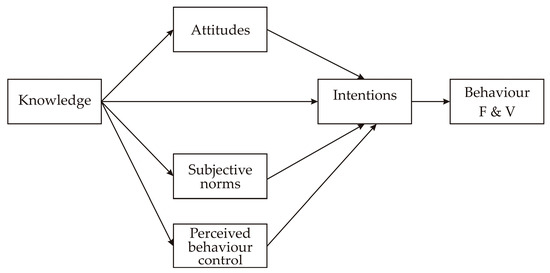 In order to explain and test the main determinants of F&V consumption among consumers in Serbia, during the COVID-19 outbreak, the theory of planned behavior (TPB) was used as a theoretical framework as it is often applied in analyzing consumers’ behavior patterns [18]. Keeping in mind that this theory may not necessarily capture all predictors of more complex behavior, according to the Ajzen’s recommendations, the theory was expanded with additional construct of “knowledge” [19,20] (Figure 1). Different studies confirmed that TPB predictive power increases when adding knowledge because the greater knowledge somebody has, the more confident they will be when making decisions [21].