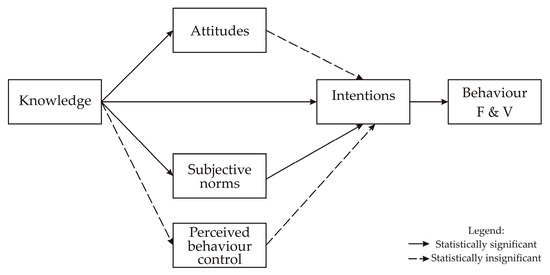 The questionnaire items were measured according to [19]. TPB constructs were measured on 5-point Likert scale (1 denotes “strongly disagree” and 5 “strongly agree”) (Table 2) [23]. The data were analyzed to confirm the correlational relationships between knowledge, attitudes, subjective norms and perceived behavioral control with consumers’ intentions and F&V consumption behavior.