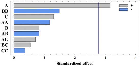 Figure 1 shows that volatiles extraction was only significantly influenced (95% confidence) by the positive effect of the extraction temperature (A). Thus, the extraction yield increased with temperature, and was proportional to the increase in the analyte diffusion coefficient. Bezerra et al. reported similar results when optimization of the volatile-compounds extraction in caprine Coalho cheese was carried out using a response-surface methodology [33]. However, a negative A2 interaction effect has been shown. This fact could be related to the partial degradation of some compounds linked to the formation of aromatic compounds due to the Maillard or caramelization reactions.