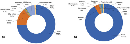 Average percentages of the classes of volatile compounds found in PDO (a) and non-PDO (b) cheese samples.